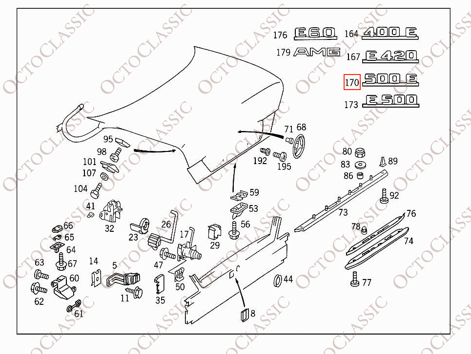 Self-adhesive 500E emblem and nameplate for the trunk lid.